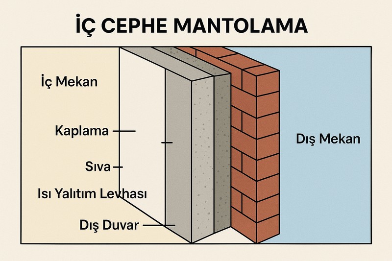 İç cephe mantolama, binaların iç mekanlarındaki duvar yüzeylerine yapılan ısı ve ses yalıtımı uygulamasıdır. Genellikle dış cephe yalıtımı yapılamayan durumlarda veya her daire sahibinin kendi alanında yalıtım ihtiyacı olduğunda tercih edilir. Bu yöntemde duvarlara özel yalıtım levhaları, keçe ya da köpük malzemeler uygulanır; üzerine sıva veya alçıpan döşenerek dekoratif bir yüzey oluşturulur. Mantolama terimi normalde dış cepheye yapılan yalıtım anlamına gelse de, iç cephede de benzer prensiplerle yalıtım yapılması mümkündür. Dış cephe mantolamasına kıyasla daha sınırlı avantajları olsa da, doğru malzemeler ve yöntemlerle iç mekan konforunu artırmak için etkili çözümler sunar.